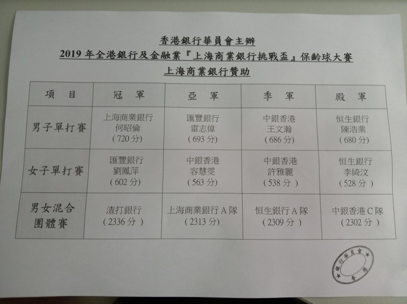 已於8月4日完滿結束,在此鳴謝 "上海商業銀行的贊助 " 今年都設立了冠、亞、季、殿軍4個獎項。 男子單打更打破了上年紀錄奪得720總分奪冠,希望明年更勝今年!